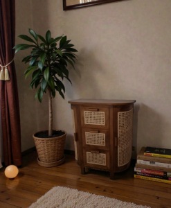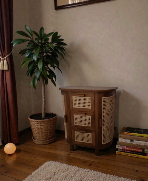 The doors on the sides and the drawers are handwoven with rattan, giving breathability to the contents inside the sideboard.