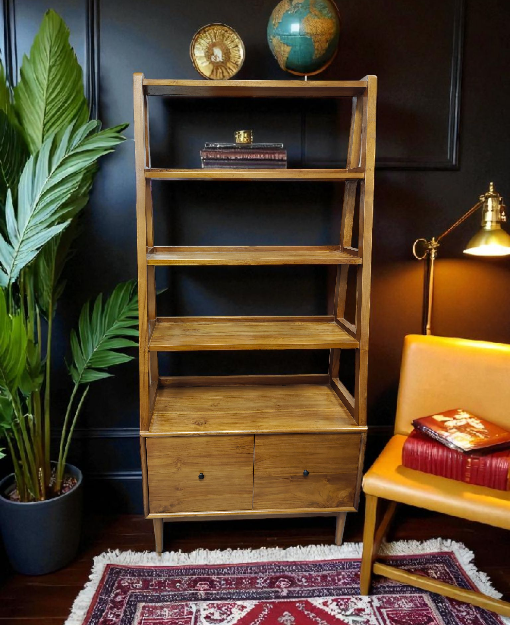 It features 5 shelves with various wideness and two storage units at the bottom, providing space for both display and storage.
