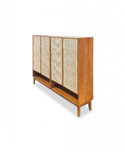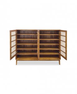 Add a warm, natural touch to your entryway with the Penina Teak Shoe Cabinet. Crafted from durable teak wood and accented with woven rattan panels, this 4-door cabinet blends classic charm with practical function. Inside, you’ll find generous shelving space designed to keep your footwear neatly organized — from heels to sneakers to bulky boots.