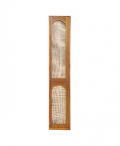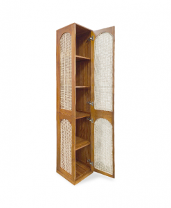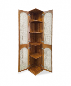 The Rashelle Teak Corner Cabinet Rattan features 2 long doors and 5 compartments, offering organized storage.