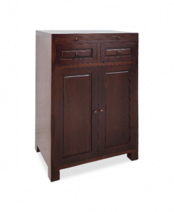 The Robby Teak Altar Table with four sturdy legs features a sliding tray, 2 drawers, and 2 doors, providing ample storage while serving as a centerpiece for your sacred space.