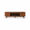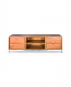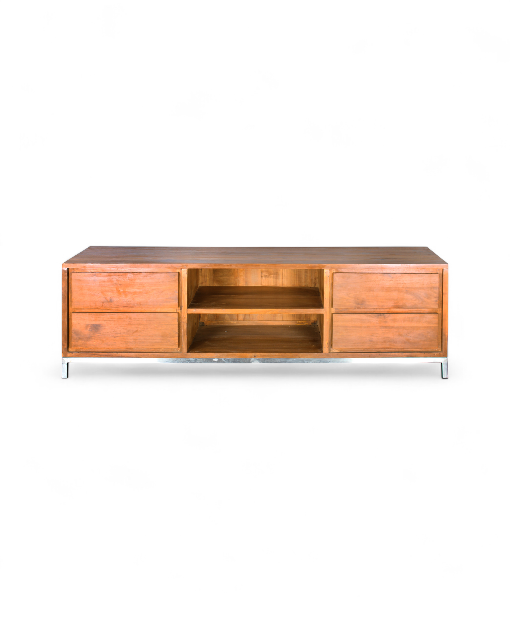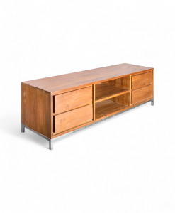 The Sherlock Teak TV Console features 4 drawers—2 on each side—and 2 central open compartments for media devices.