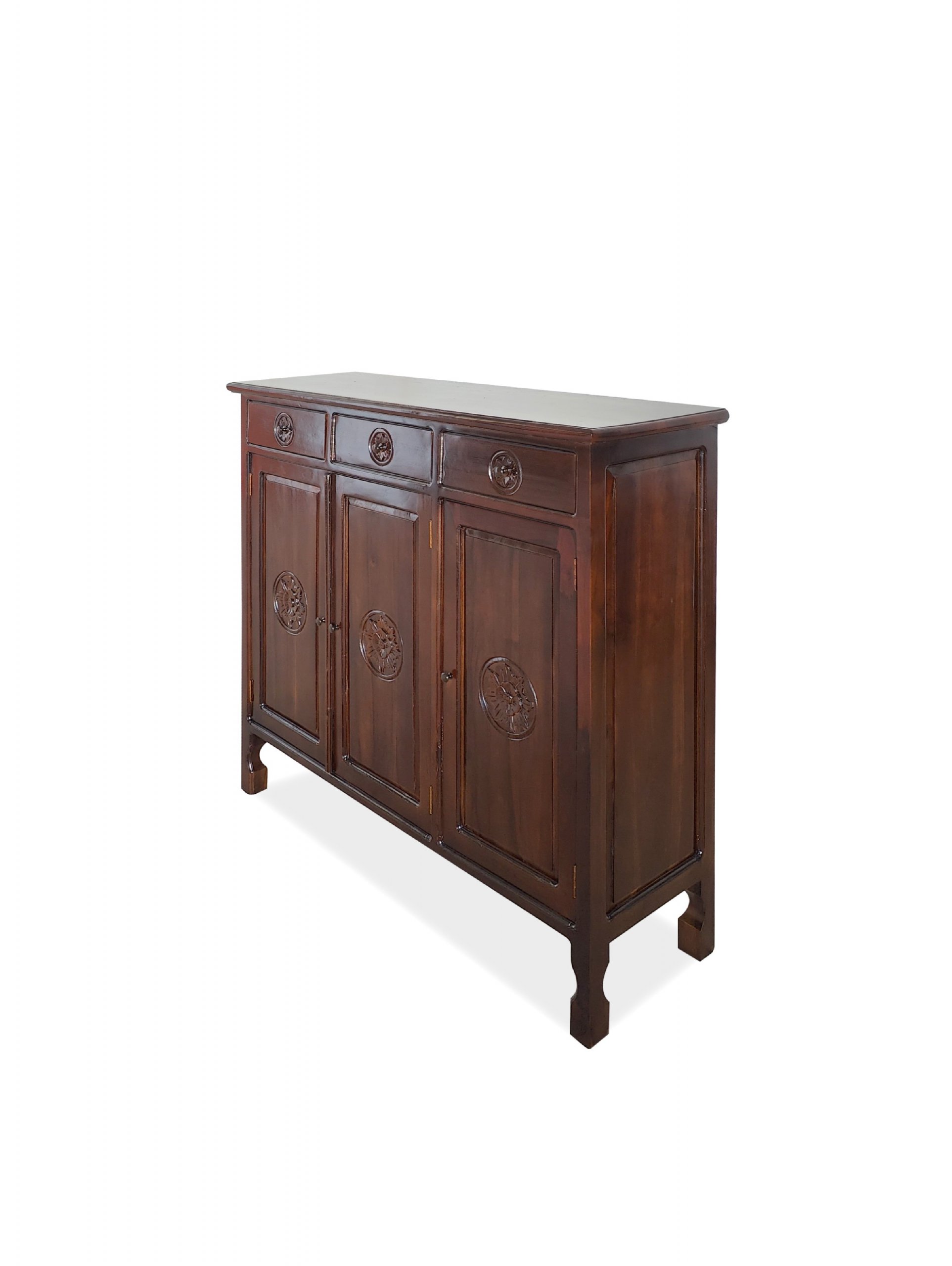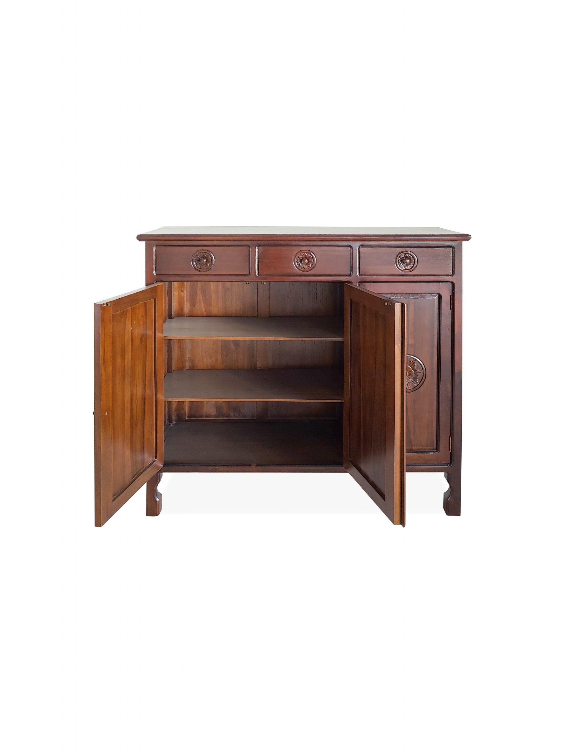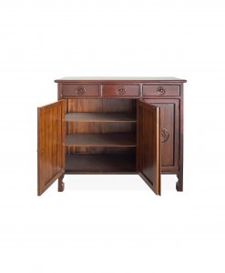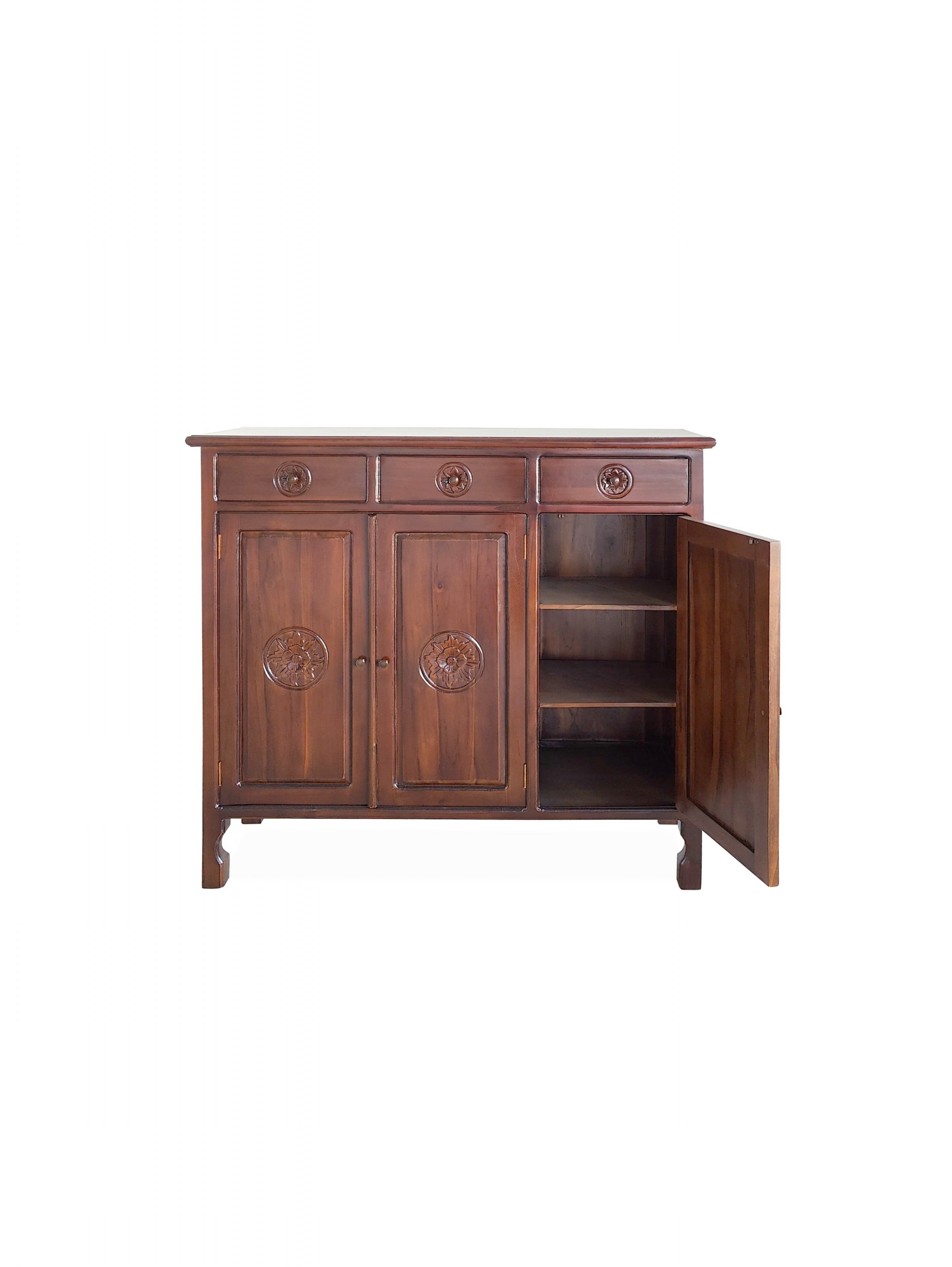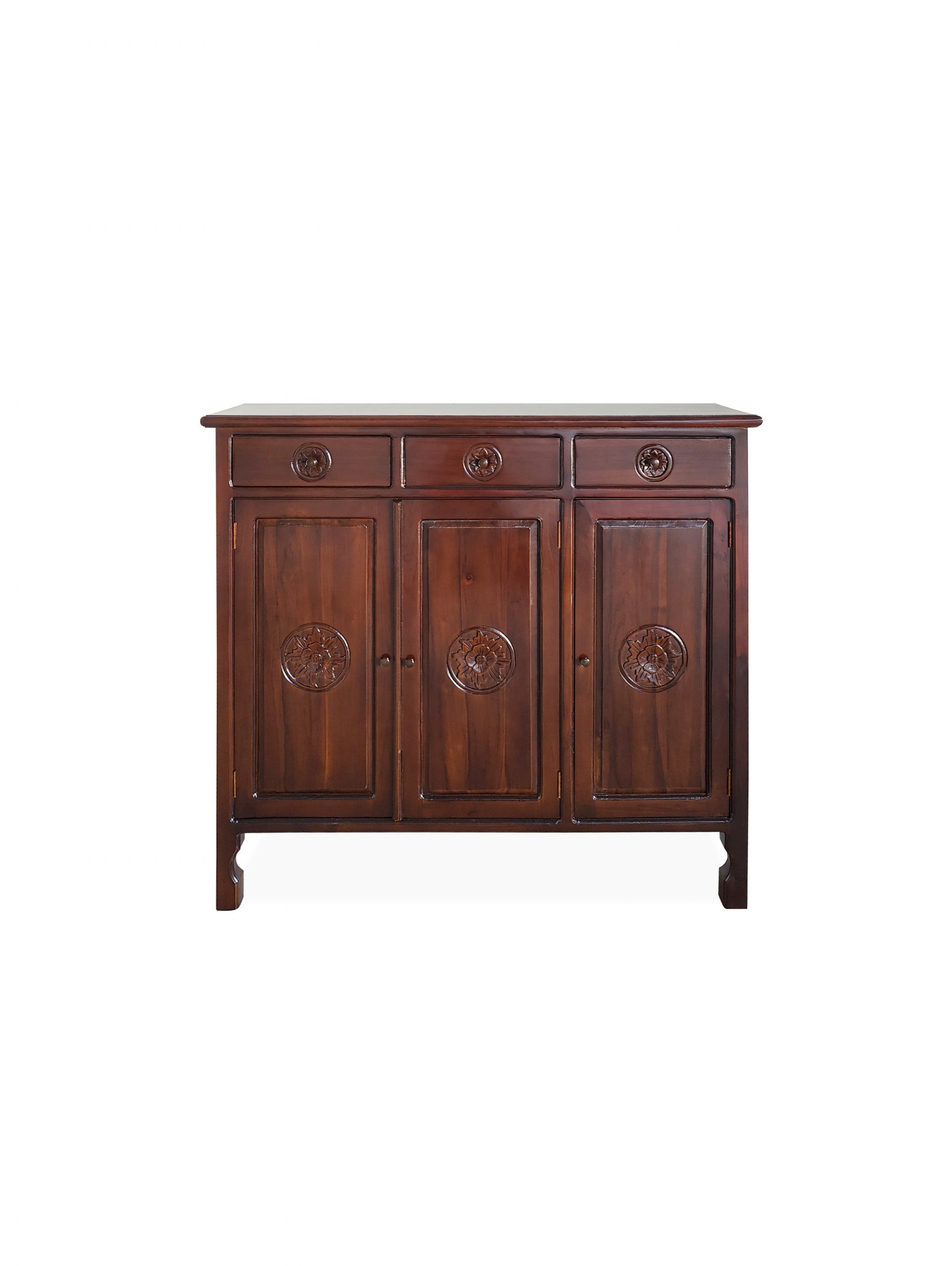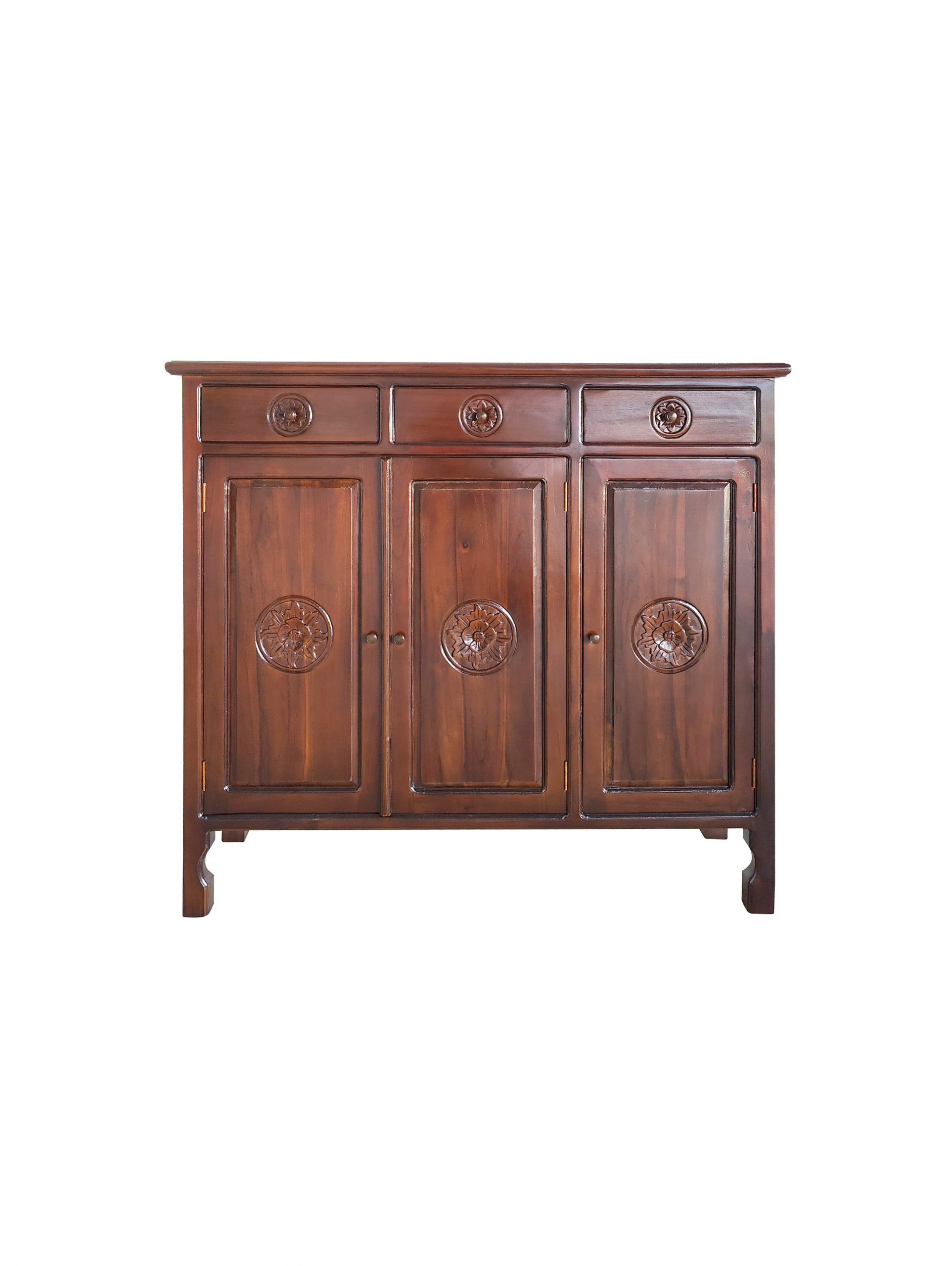 Transform your living room with our solid teak wood Bali design storage cabinet, featuring three drawers and three doors.